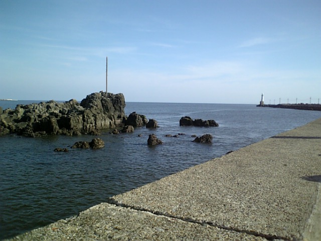 大きい岩場正面でも釣れるのですが、ショアジグロッドが10フィートと長いので電線が無く一段高い堤防からのキャストです。