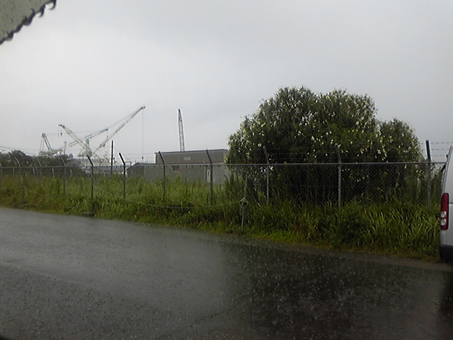 ▲雨の自衛隊堤防前の路上