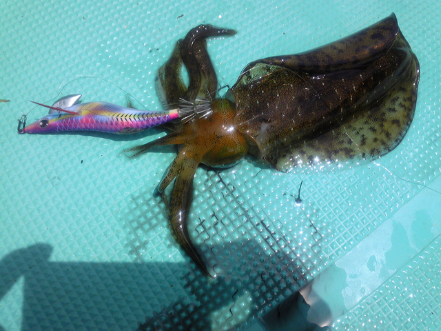 すぐにボート下にエギを落とし、シャクるとちゃんと乗ってきました。